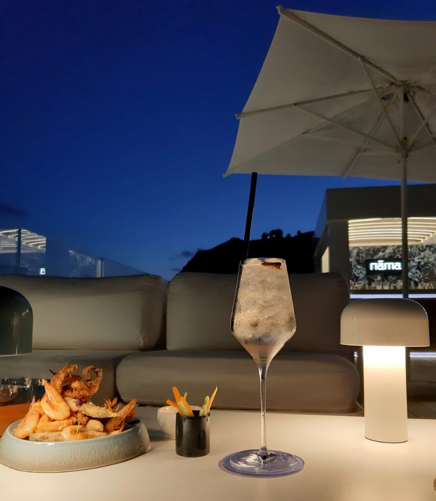 Al tramonto la sauna finlandese con vista sull’azzurro del mare unito ai caldi riflessi rossi del sole anticipa l’aperitivo sul roof del Nāma, che in lingua sanscrita significa “mente”, l’altra parte da coccolare dopo il benessere del corpo. Il restaurant manager Michele Gionti offre spunti interessanti per il percorso gastronomico, accompagnato dai cocktail contemporanei della barlady Lucrezia Scotto e da una wine list densa di referenze regionali dal corretto rapporto costo-qualità.