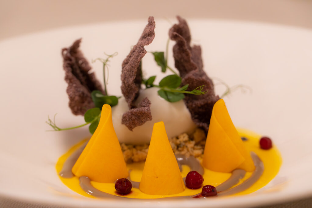 Sorprendente pure la battuta di manzo con toast di coda di bue alla vaccinara e il gelato all’erborinato con royale di zucca, mirtillo rosso e semi di zucca, per soddisfare anche le esigenze vegetariane degli avventori.