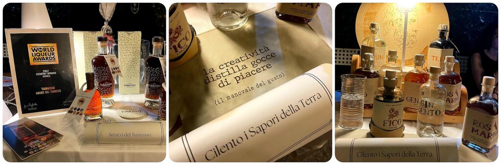 Una cucina genuina e dedita al rispetto delle tradizioni con l’abbinamento ad alcuni vini coraggiosi e unici, tipicamente cilentani, delle cantine presenti all’evento. Particolare menzione meritano l’attraente e strutturato Antece 2022, il fiano della DOC Cilento, macerato in anfora, dei Viticoltori De Conciliis; l’elegante e fresco Rosato Ronnorà 2023, PAESTUM IGP ROSATO 2023 della cantina Donna Clara; il ramato e luminoso Ephyra 2023, IGP Campania di Rossella Cicalese; il biologico e fruttato Phasis 2023, Fiano Paestum I.G.P- Tenute del Fasanella; l’aromatico Iscadoro 2022, IGT Paestum della Cantina Casebianche. Nel post-dinner, hanno deliziato i palati i ricercati liquori e gli affascinanti distillati dell’Alchimista incantatore Giuseppe Pastore (Cilento, I Sapori della Terra) e l’artigianale Amaro del Tumusso, affinato in anfora, la cui miscela di genziana, alloro, carciofo, elicrisio, rafano e altre erbe autoctone segrete lo rende aromatico, avvolgente e morbido.
