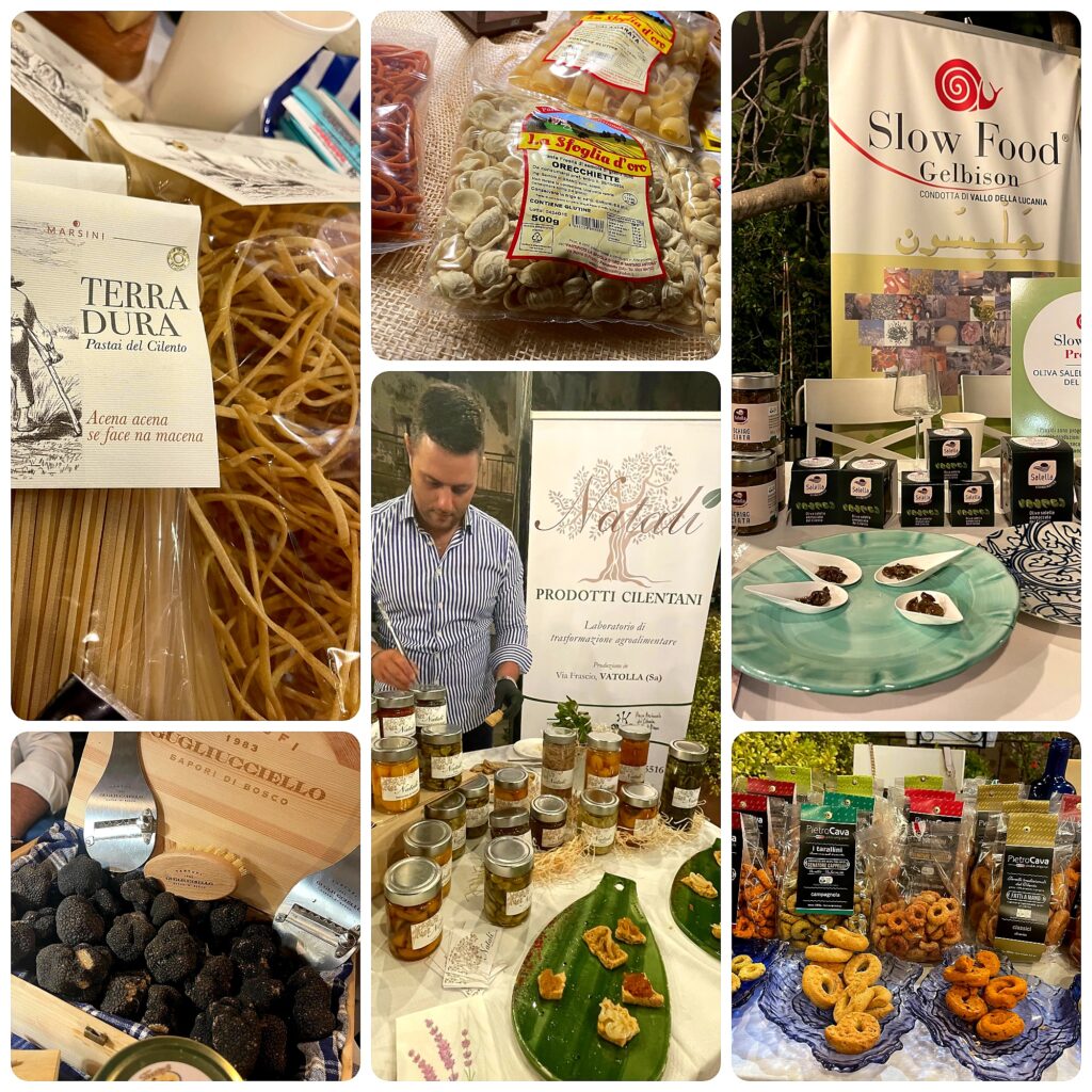 I vini autoctoni e biologici dell’alto e basso Cilento (Paestum, Perdifumo, Licusati, Prignano Cilento, Sant’Angelo a Fasanella, Giungano, Castellabate, Punta Licosa, Torchiara, Rutino), la soppressata di Gioi, lo struffolone e le olive ammaccate di Salento, le Alici di Menaica di Pisciotta, le ricotte e le mozzarelle di Paestum, l’Amaro del Tumusso di Padula, i salumi e i formaggi del Vallo di Diano, i panettoni di Agropoli, il fico, la genziana e il rosmarino distillati di Casalvelino, la cipolla di Vatolla, i taralli dai grani antichi di Sala Consilina, i tartufi di Colliano, la pasta fresca di Palomonte, i fagioli di Controne sono solo alcune delle tappe del lungo e suggestivo viaggio.