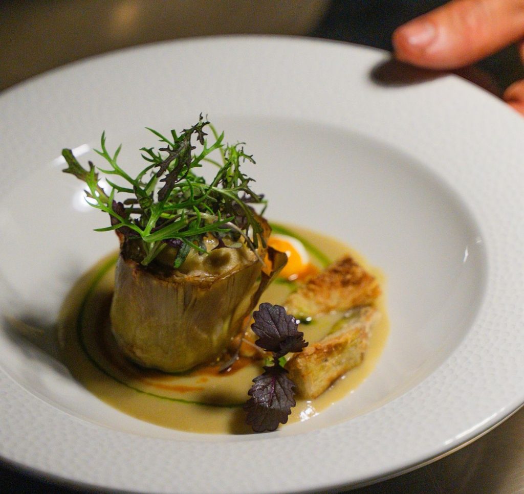 Le proposte della brigata in cucina comprendono carciofo in doppia consistenza con gamberi, raviolini di pasta bianca fatti a mano ai funghi porcini, zucca e salsa di provola e filetto di vitella con rollino di verza, agrumi e patate arrosto.