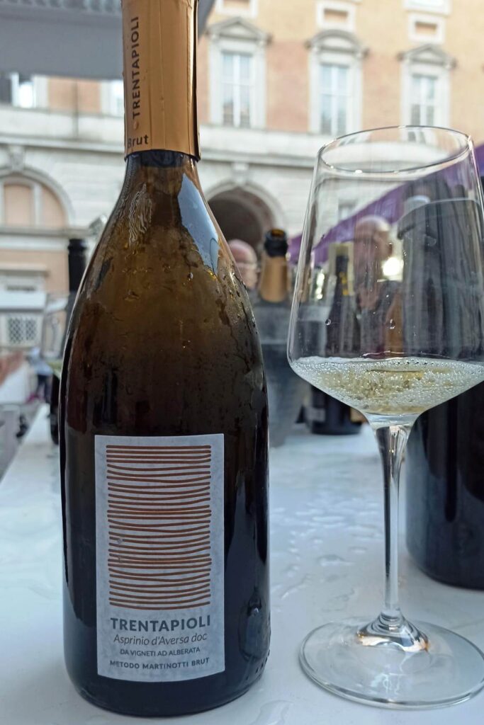 Ancora un metodo martinotti quello che riempie il terzo calice, Trentapioli brut Salvatore Martusciello, presentato direttamente dal produttore, Gilda Guida Martusciello, che definisce l’alberata “un monumento alla vita di campagna”. Alla famiglia Martusciello dobbiamo le prime sperimentazioni, a partire dal 1983, di spumantizzazione dell’asprinio. Trentapioli è uno charmat lungo, 6 mesi in autoclave; l’olfatto è pungente di limone salato e gelsomino, mentre al sorso è croccante di mela verde.