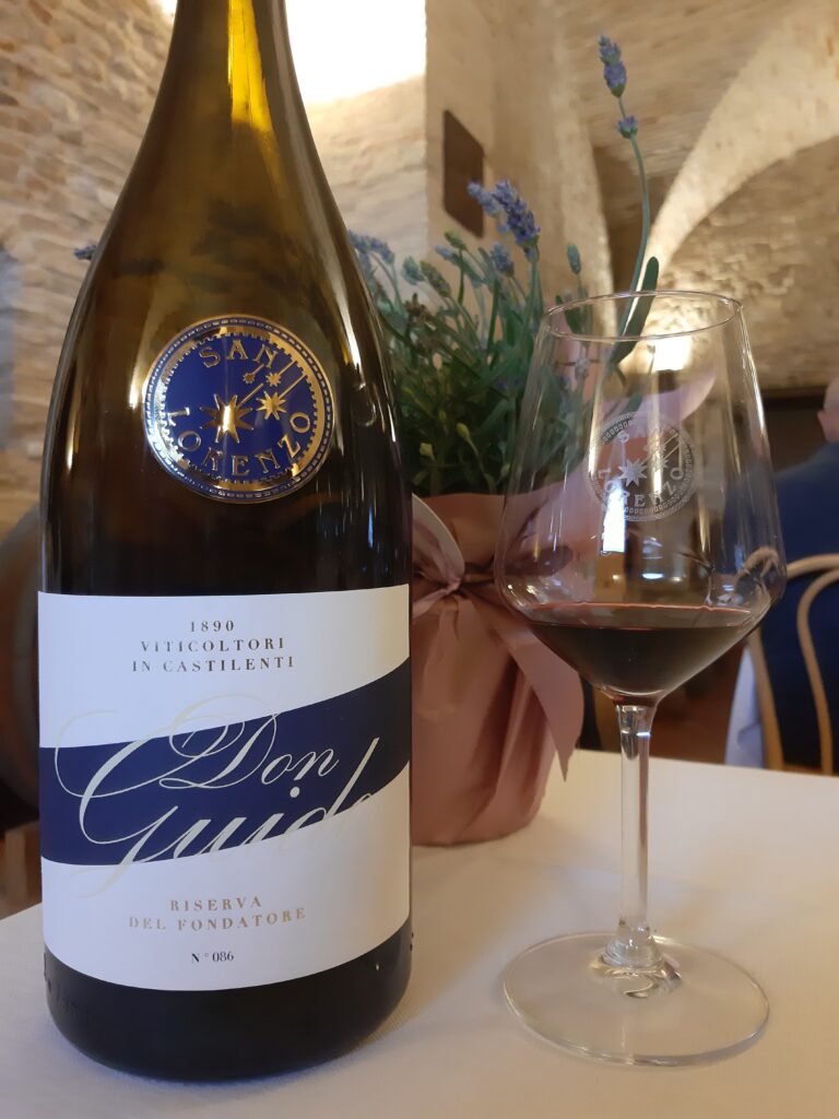 Gli ettari vitati sono 168 suddivisi tra l’areale di collina di Castilenti e quello prospiciente al mare a Pescara, curati dallo zio agronomo Gianfranco Barbone. I vini vengono poi predisposti stilisticamente dall’enologo Riccardo Brighigna, un vero numero uno in Abruzzo, che ci racconta l’idea del nuovo nato di casa San Lorenzo, il Don Guido: <<con il Colline Teramane Montepulciano d’Abruzzo Riserva “del Fondatore” abbiamo optato per un appassimento breve che conferisce maggiore morbidezza al vino, con un successivo affinamento in tonneau per sette anni. Questo lungo tempo gli dona eleganza e morbidezza e un tannino per nulla invadente>>.