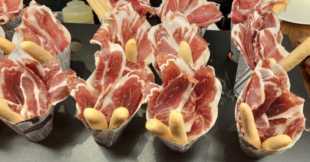 Ai colleghi presenti, Nacho ha spiegato le caratteristiche dei prodotti tipici spagnoli, in primis “el jamón”. È seguita la degustazione del pregiato prosciutto, rigorosamente tagliato a coltello e di alcune preparazioni, il tutto accompagnato da una valida proposta vini. Nacho nel suo discorso, afferma di selezionare ingredienti di elevata qualità che ho avuto il piacere di riscontrare negli assaggi odierni, tutti semplici ma decisamente gustosi.