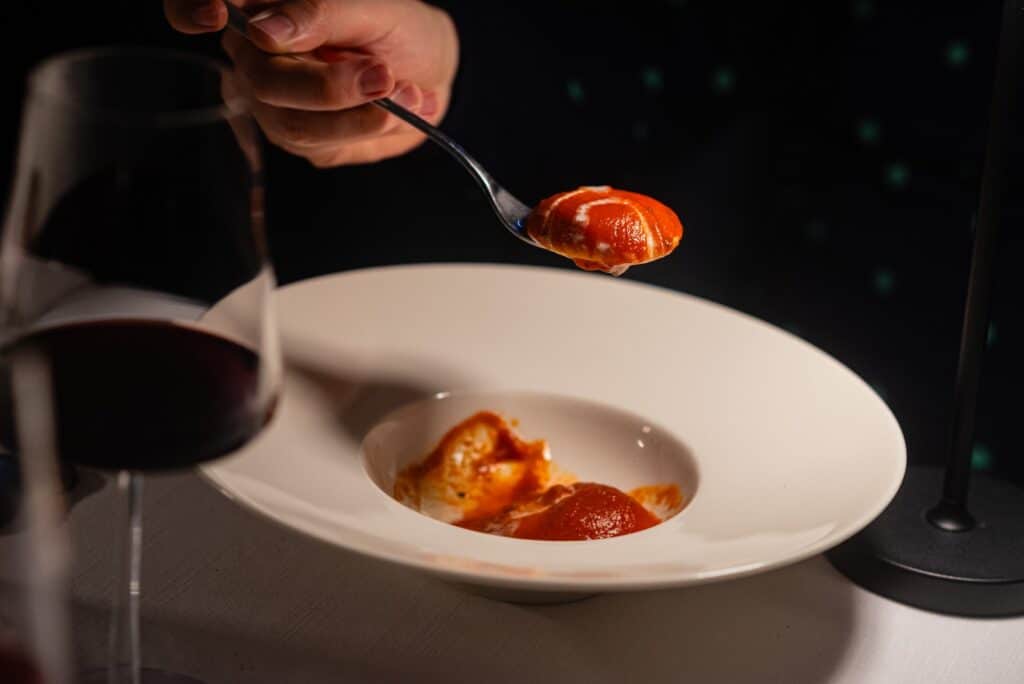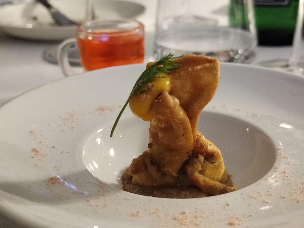 Il primo piatto vuol essere una dedica ai trascorsi lavorativi dello chef sull’isola più glamour del mondo. “Made in Capri” è, infatti, l’interpretazione fatta raviolo di Armonì. Grande manualità nel sigillare la pasta, abbastanza consistente nello spessore, ripiena di caciotta e condita con sugo di pomodoro, maggiorana e salvia, su acqua di provola. Un gioco di tendenze dolci, il contrasto con l’aromaticità delle erbe e l’affumicato del latticino, con una certa acidità, è una carezza palatale grazie a quel velluto di pomodoro che ha ingolosito i presenti al punto da richiederne un supplemento di dose.