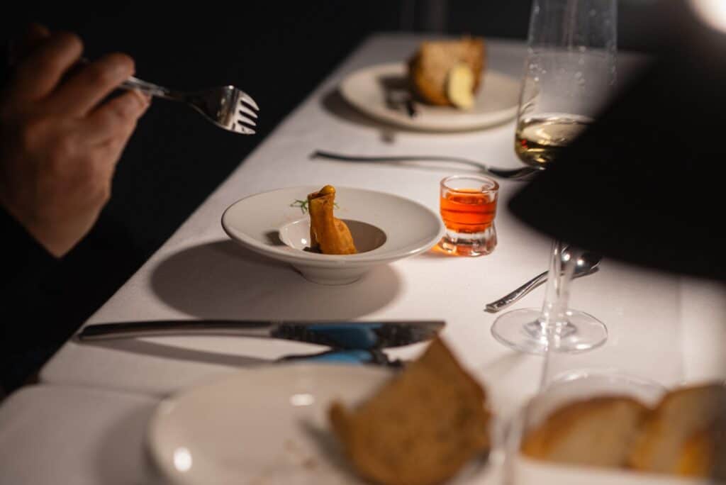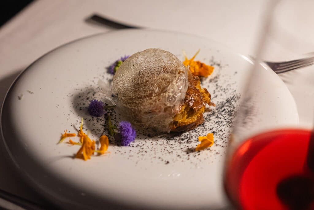 L’interpretazione finger della genovese, perfettamente coerente col suo sapore e accompagnata dal drink al cucchiaio, ha dato croccantezza al morso senza togliere autenticità alla tradizione. Presente in tavola il pane multicereali preparato dallo chef unito all’ottimo burro fresco. Si prosegue con un Piedirosso dei Campi Flegrei e ancora una volta la cipolla montorese domina la scena: la frittata della nonna, nello stile fluffy della tortilla è un tuffo nel passato condito di eleganza, grazie al Crystal Bread e alla sua polvere bruciata.
