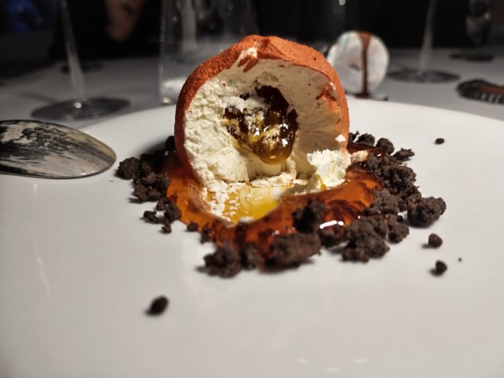 Gran finale arriva con la solarità del color arancio a ricoprire una sfera di mousse dal cuore dolcissimo: Sweet Solfatara è un omaggio al mandarino dei Campi Flegrei, diventato PAT – prodotto agroalimentare tradizionale – grazie al lavoro assiduo di Domenico Ferrante e di alcune associazioni locali. La coccola pasticcera della crema, in contrasto con le note agrumate della marmellata e unita al crumble di cioccolato, è stato il coronamento di una cena di altissimo livello, oltre ogni aspettativa.