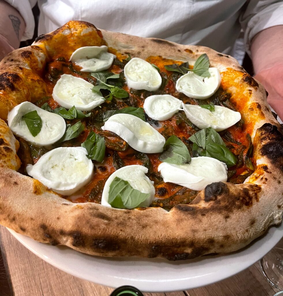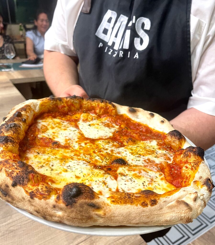La pizza è contemporanea, leggera e con un cornicione lievemente alveolato, omaggiando le origini ercolanesi della famiglia Bani. L’impasto per la napoletana è diretto: lievitazione di 24 ore e blend di cereali diversi; per la pizza romana si prevede invece un pre-fermento, idratazione più spinta e adeguata maturazione.