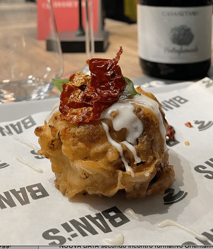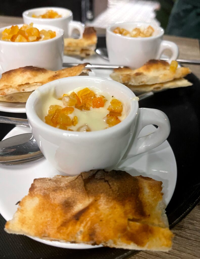Dulcis in fundo, è la geniale proposta di dessert, ‘Na tazzulella ‘e crema alla Bani’s con crema pasticciera, arancia vesuviana candita e spicchi di pizza croccante che riesce a concludere in trionfo la serata.