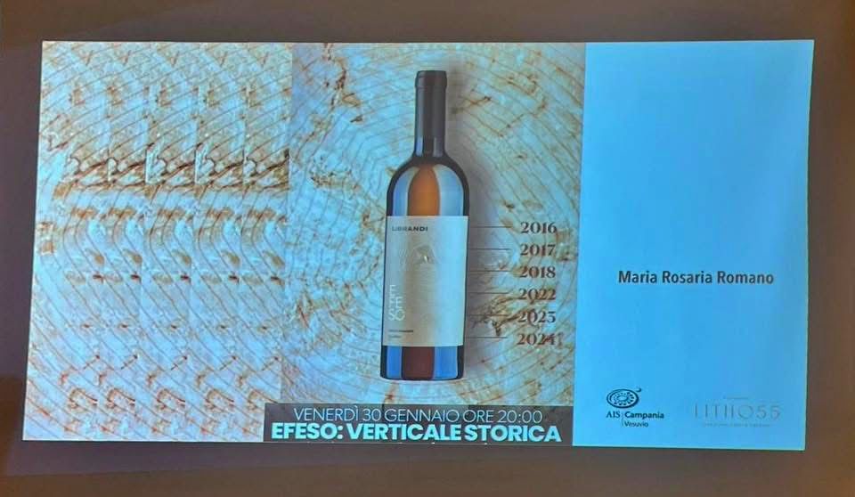 Per la prima volta in Italia, Ernesto Lamatta – Delegato AIS Vesuvio – ha organizzato la prima verticale storica di Efeso dell’azienda Librandi. Prodotto da uve Mantonico Bianco, vitigno riscoperto e valorizzato dopo anni di ricerca sul territorio, il vino ha dimostrato complessità, opulenza ed eleganza, espressione di straordinaria longevità e finezza.