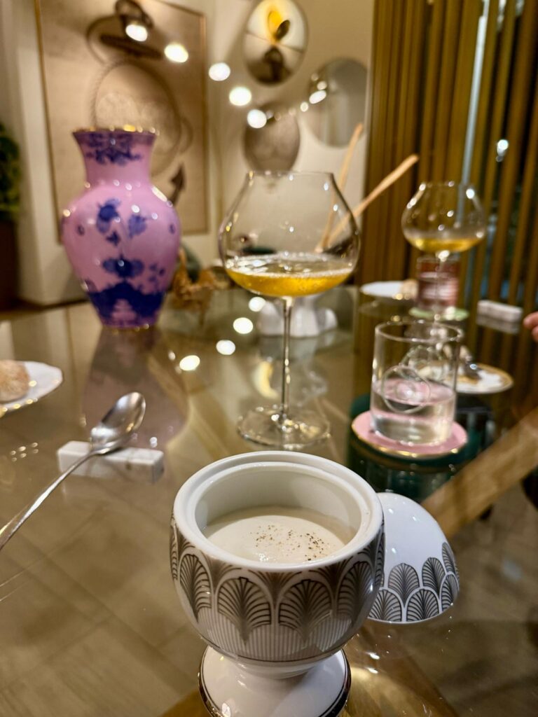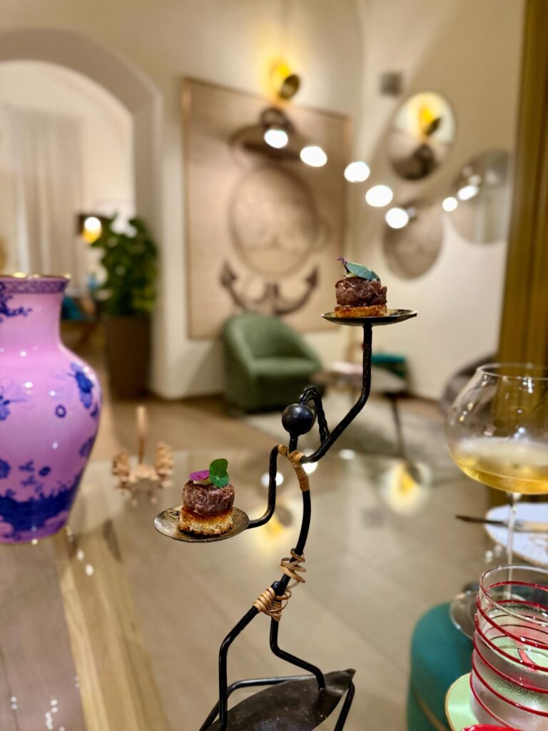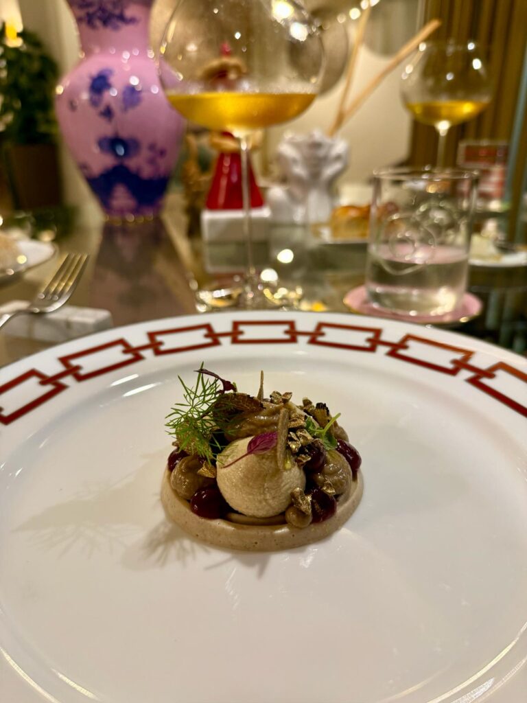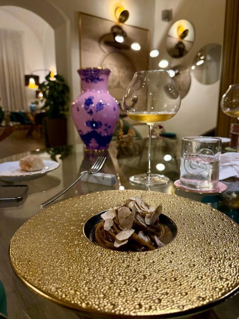 Oltre ai piatti à la carte, due i menu degustazione. Noi nostalgici del foliage dai colori caldi, scegliamo il menù di terra abbinato ad uno Chardonnay di marca francese ad impreziosire il tartufo bianco e il wagyu che troveremo più avanti nel percorso.
