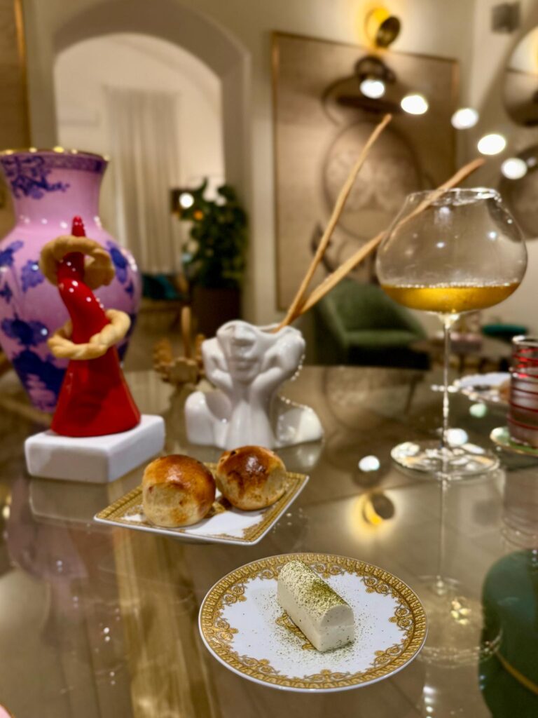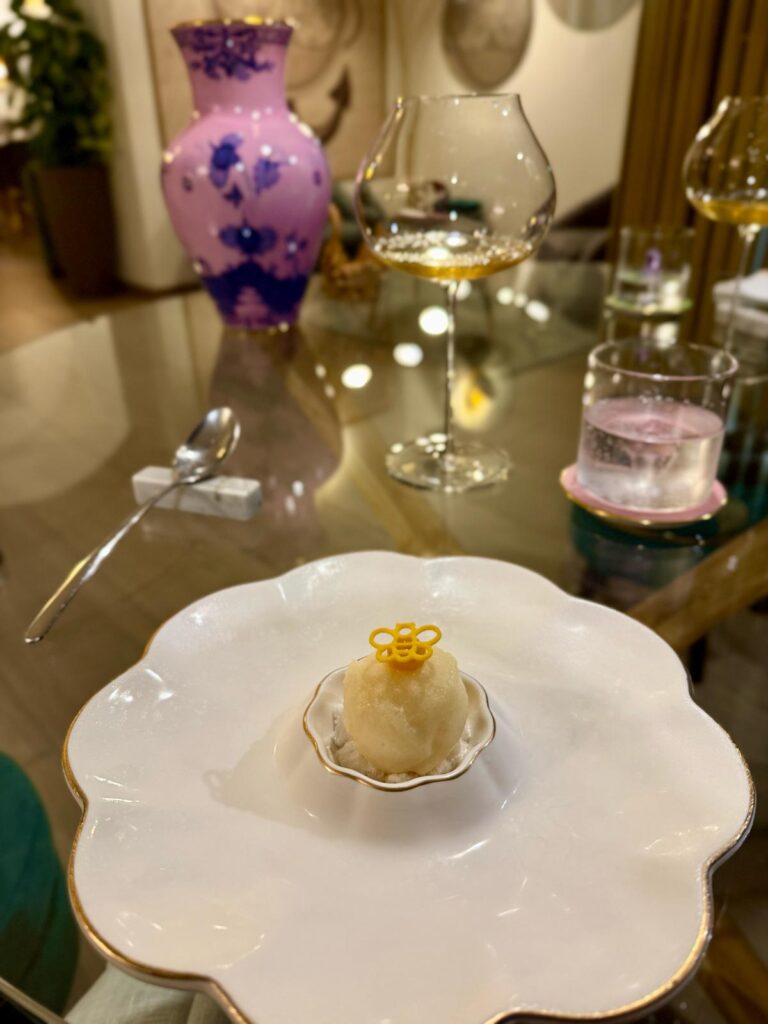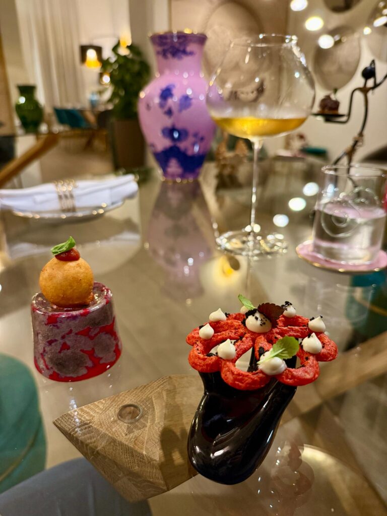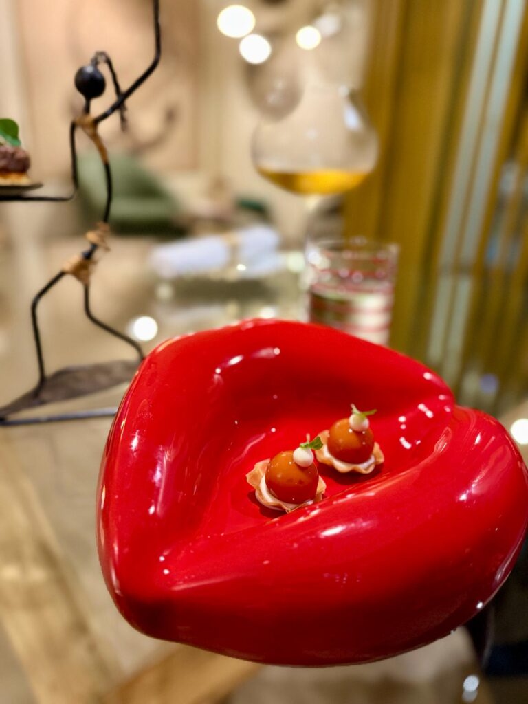 Oltre ai piatti à la carte, due i menu degustazione. Noi nostalgici del foliage dai colori caldi, scegliamo il menù di terra abbinato ad uno Chardonnay di marca francese ad impreziosire il tartufo bianco e il wagyu che troveremo più avanti nel percorso.