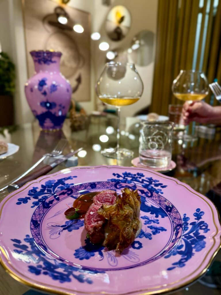 Dai boschi piemontesi facciamo invece un salto in oriente con il wagyu accompagnato dal carciofo e topinanmbur, sosta perfetta per accompagnarci nel seguito del film.
