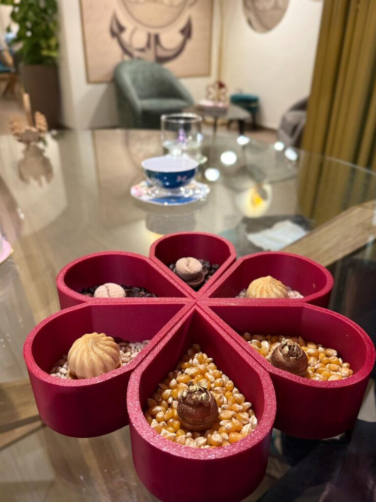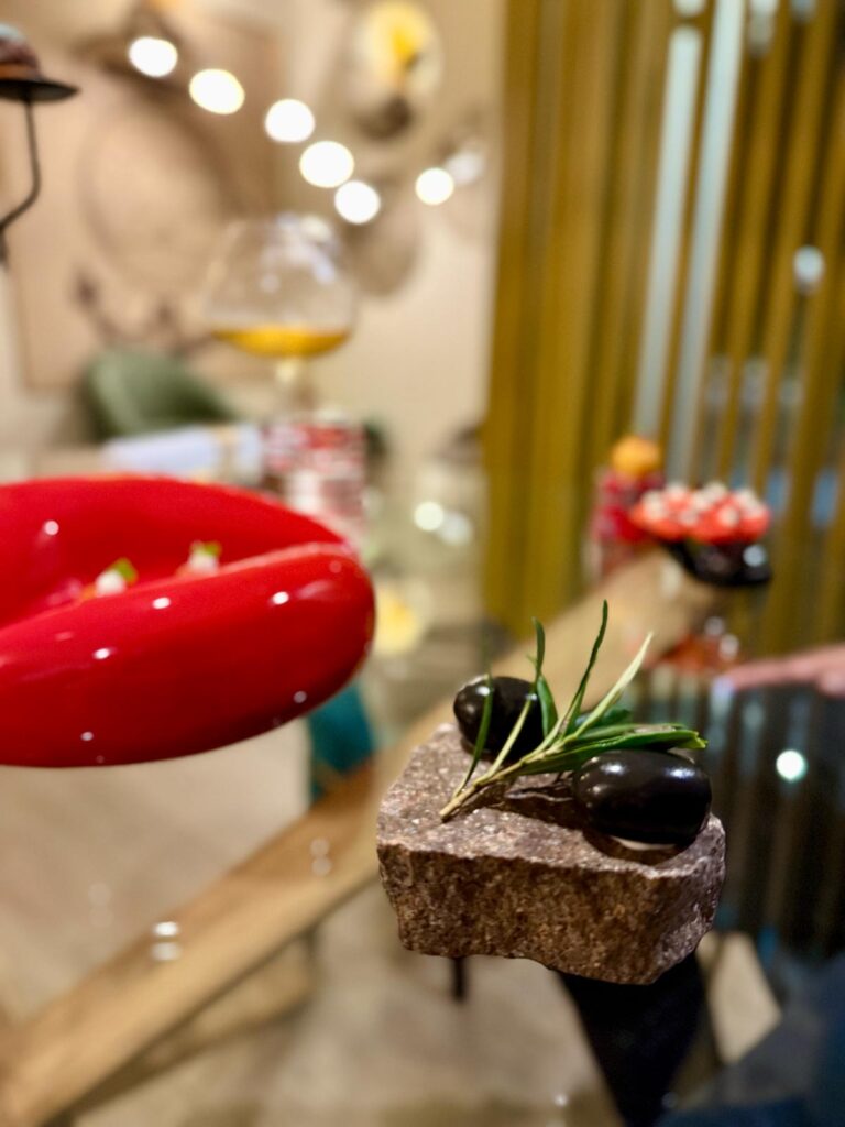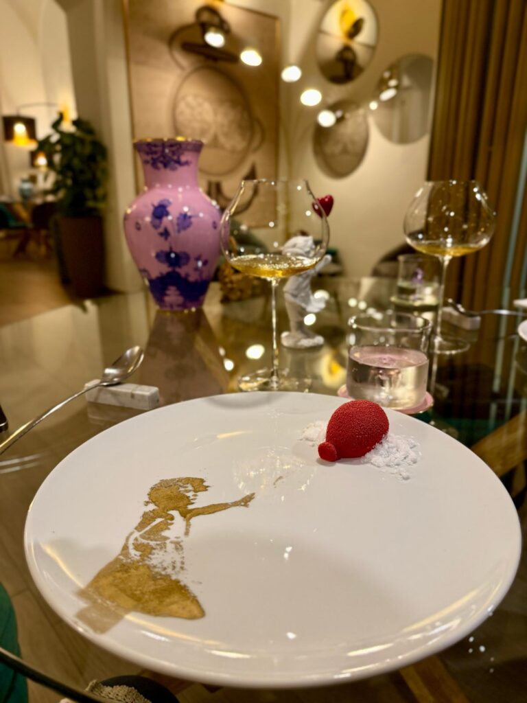 “Ape regina” con agrumi, miele millefiori e bergamotto, a seguire Banksy – tributo al famoso street writer – un guscio di cioccolato bianco con cuore di fragole, vaniglia e menta. Ultime, ma non per importanza, le mini coccole dolci, adagiate su mais per pop corn, in piccoli vassoi che formano la stella della Michelin.