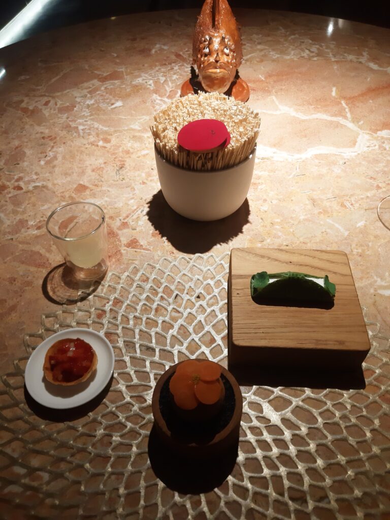 Stuzzicanti e marini gli amuse-bouche tra tartellette, fragole, sedano, kombucha di pomodoro, zeppoline con crema di porcini e wafer al pâté di fegatini.