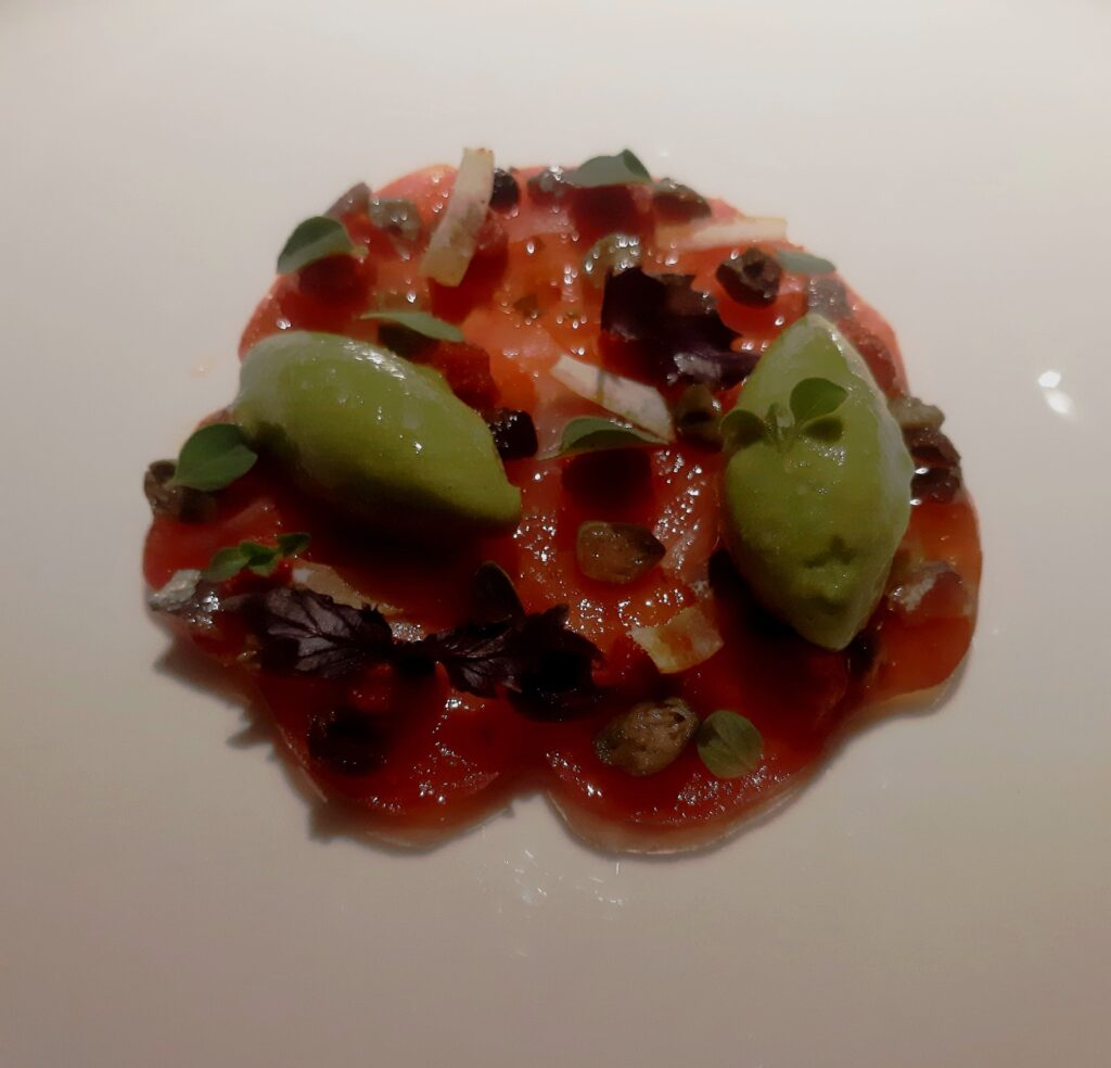 Infinitamente buono il carpaccio di pomodoro con olive, capperi ed una knell di sorbetto al peperoncino verde. La croccantezza viene giocata proprio dalla bassa temperatura del sorbetto, i sapori risultano in perfetto equilibrio.