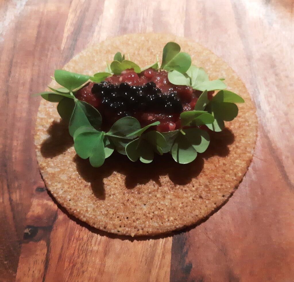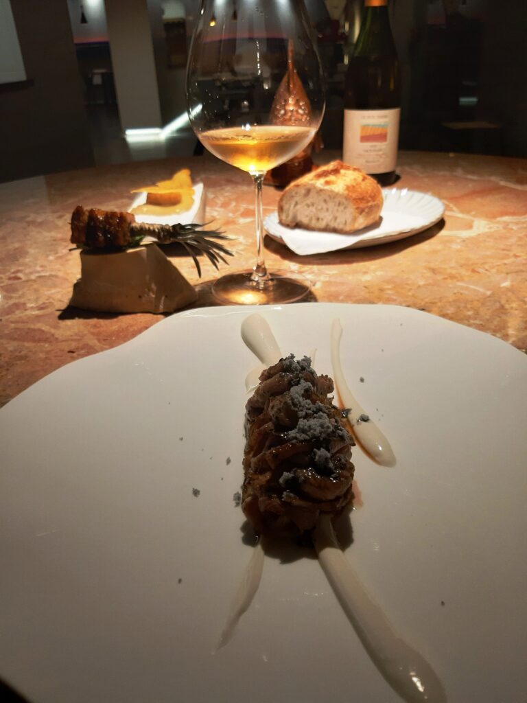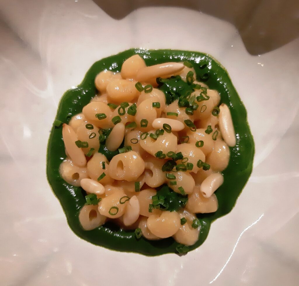 La crespella di lenticchie con ragù alla genovese, tartare di manzo e midollo rasenta il sublime per la danza perfetta tra sensazioni vegetali e parti salate. Un piatto di grande tecnica applicata alle connotazioni più identitarie della Campania.