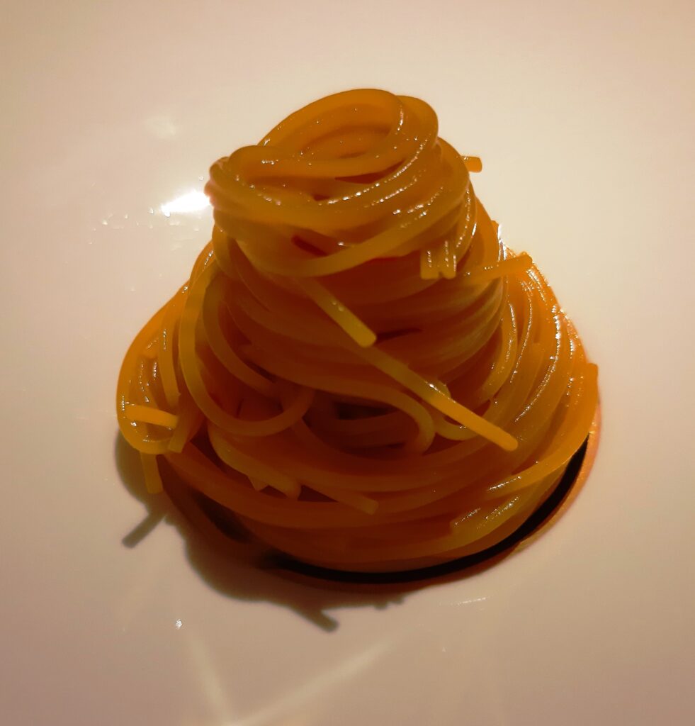Lo spaghetto allo zafferano ha contribuito al recente riconoscimento, da parte della Guida Ristoranti Gambero Rosso, quale migliore proposta di piatti di pasta, sponsor Pastificio dei Campi. Una signature storica di chef Torsiello, ideata partendo da tre brodi differenti per cuocere la pasta. Densità e gusto in un unico quadro delicatissimo.