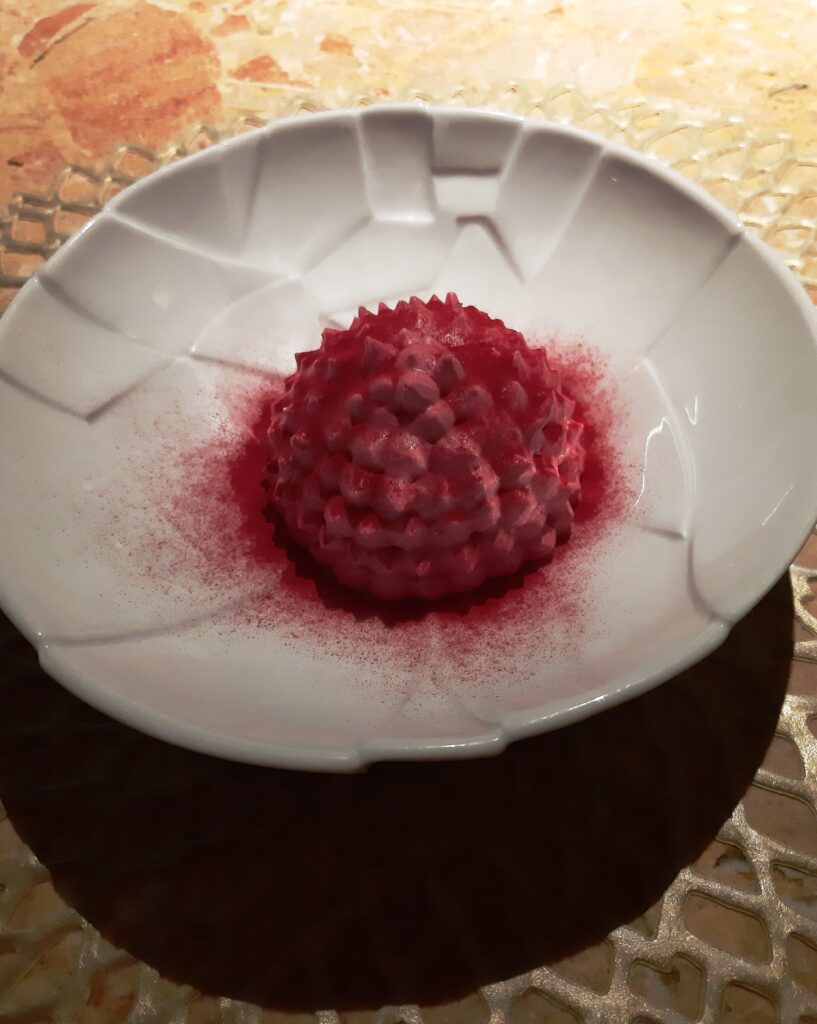 Finale su meringa di rapa rossa con namelaka al rosmarino e cioccolato bianco su composta di ciliege. Delicato, semplice e avvolgente.