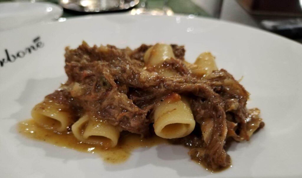 A tangibile segno di distinzione da altre realtà gastronomiche, il Carboné offre la possibilità di assaggiare dei primi piatti strepitosi: la scelta è ricaduta sulle candele spezzate al ragù di genovese, generosa nelle carni e cremosa nel rapporto con le cipolle perfettamente appassite.