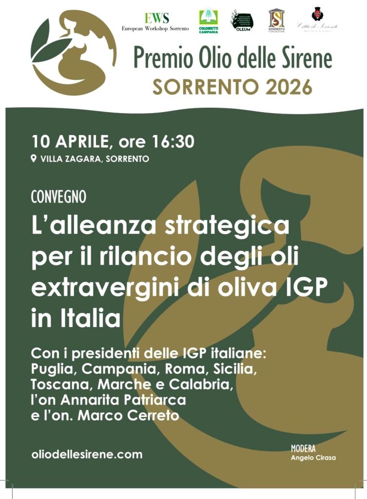 Sono stati annunciati i vincitori del Premio Internazionale Sorrento Olio delle Sirene 2026, organizzato da EWS – European Workshop Sorrento, in collaborazione con Coldiretti Campania e Oleum – Associazione Internazionale Assaggiatori Oli di Oliva, con il patrocinio del Comune di Sorrento e della Fondazione Sorrento.