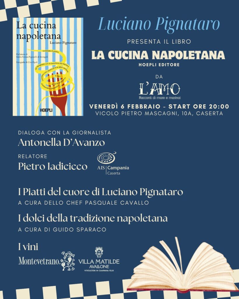 Caserta, 27 gennaio 2026 – Venerdì 6 febbraio, alle ore 20, il ristorante L’Amo Racconti di Mare di Rosario Rondinone, in vicolo Pietro Mascagni 10 a Caserta, ospiterà la presentazione del volume “La cucina napoletana” (Hoepli) di Luciano Pignataro, giornalista de Il Mattino, tra i più autorevoli comunicatori e divulgatori del giornalismo enogastronomico italiano.