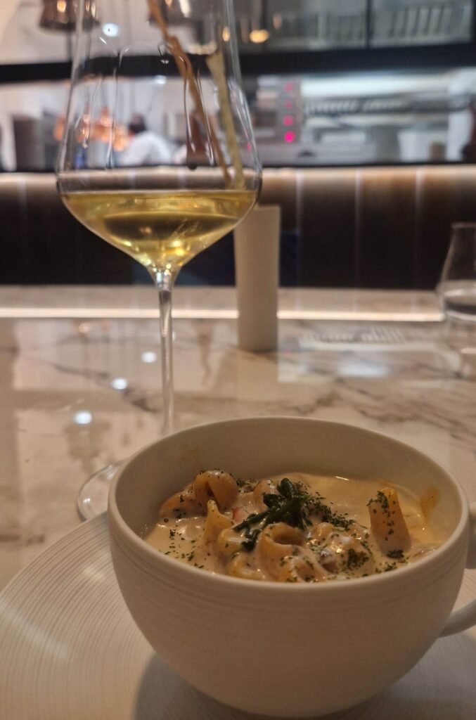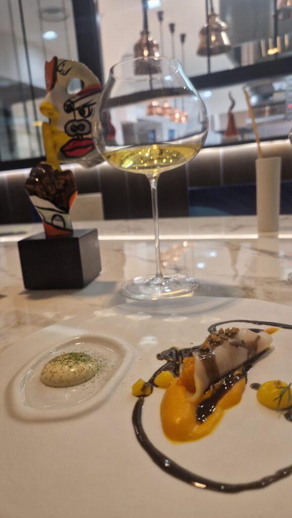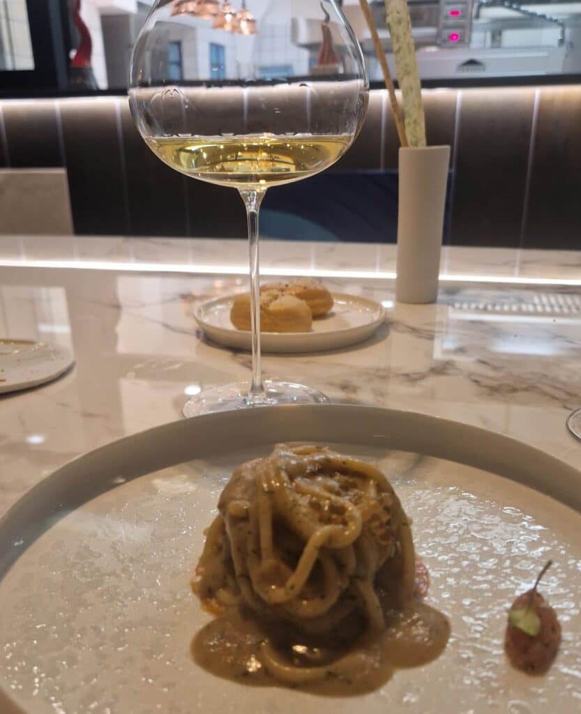 Un autentico tempio del vino, per tutti gli appassionati che desiderano condividere la gioia dell’apertura di una bottiglia di prestigio o per un brindisi da aperitivo prima di accomodarsi nell’elegante sala fine dining e continuare al tavolo con le portate di chef Roberto Allocca. Quasi 1500 referenze con alcune storiche verticali accompagnate dal racconto negli abbinamenti del direttore ed f & b manager Ivan Mendana Fernandez.