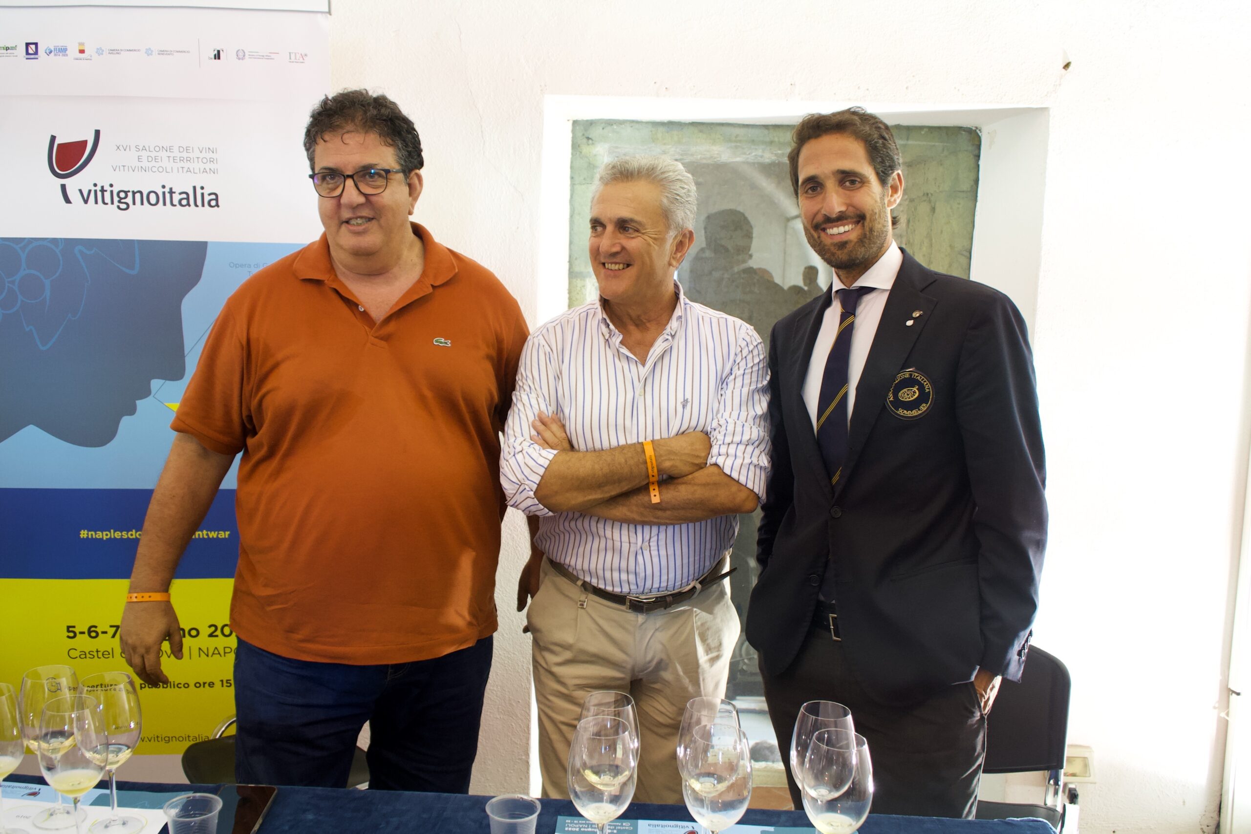 In alto, nella sala Megaride (dedicata proprio al nome dell’isolotto su cui si erge il castello) meno di 30 privilegiati, affrontano un percorso a ritroso nel tempo, che segue l’itinerario dé “il sentiero degli Dei”, in Costiera Amalfitana, dove la viticoltura eroica si pratica quotidianamente.