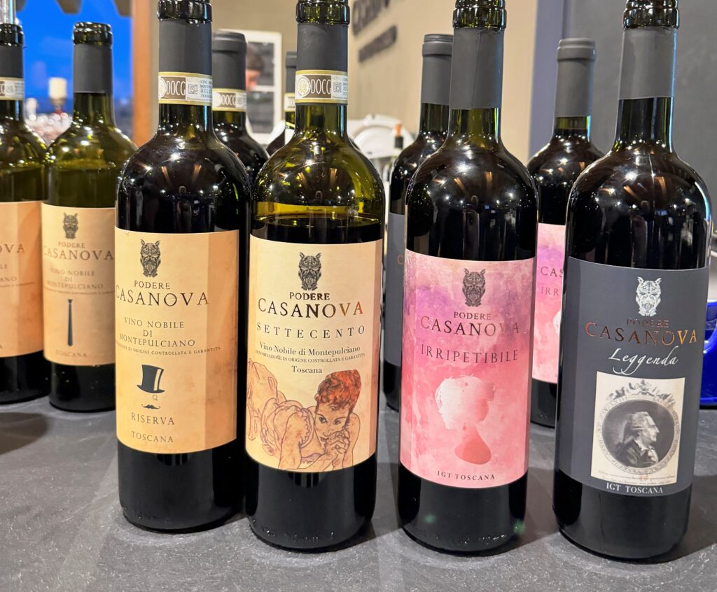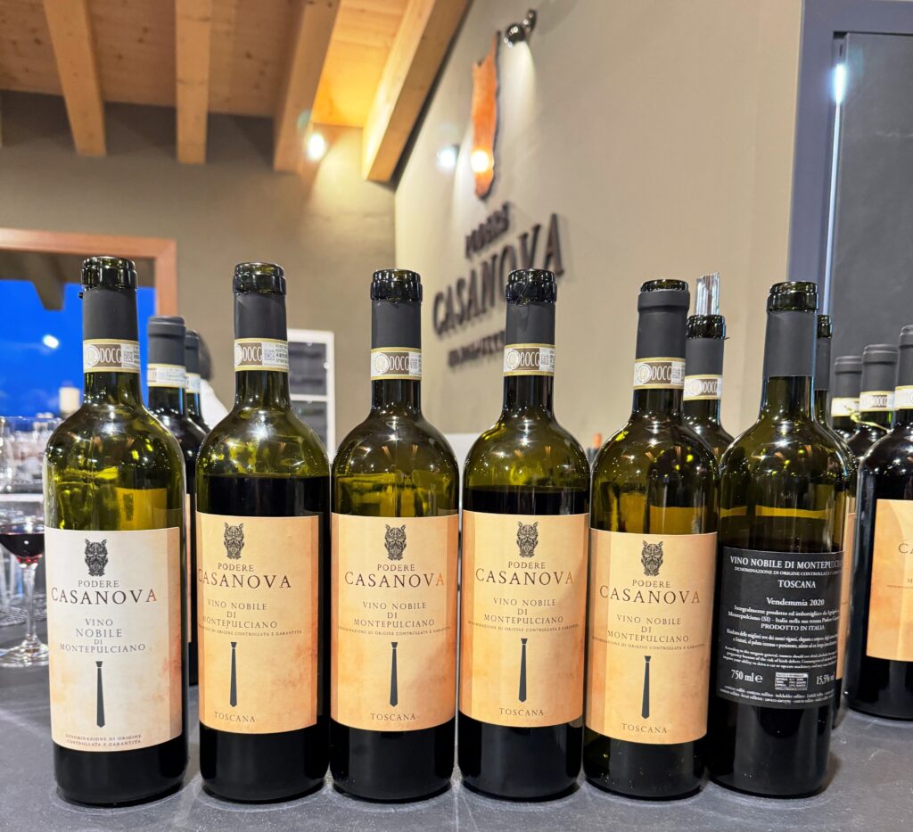 Spostiamo la nostra attenzione su tre delle undici Docg toscane: Chianti Classico, Vino Nobile di Montepulciano e Brunello di Montalcino. Il CHIANTI CLASSICO RISERVA 2018, Sangiovese con saldo di Canaiolo e Colorino, dal colore rosso rubino intenso con riflessi granato, presenta una pienezza di bocca avvolgente che richiama al sorso successivo, molto piacevole nella sua semplicità.
