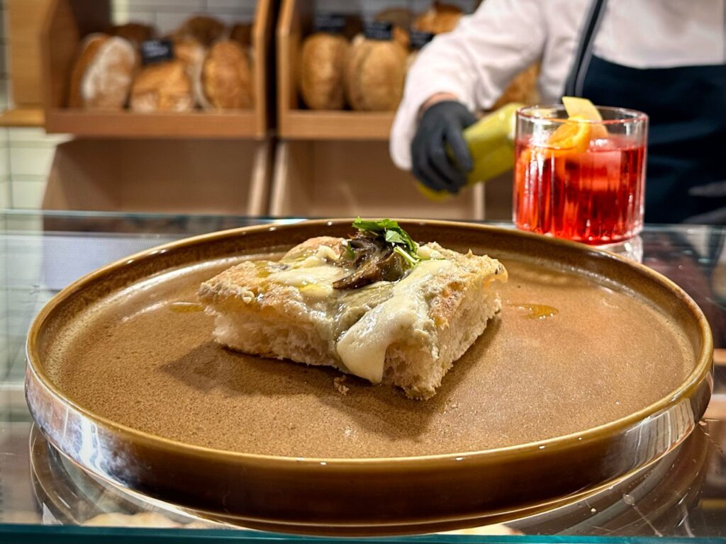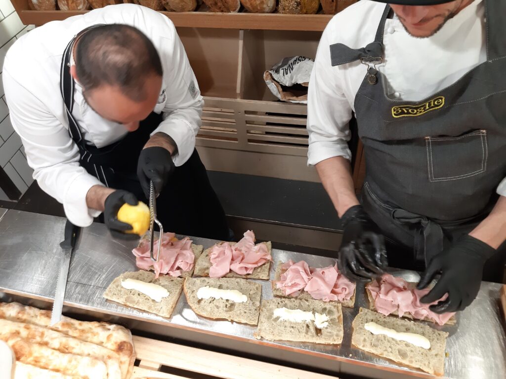 <<Il lievito madre non è sempre fondamentale>> rimarca Tafuri. <<La conoscenza della materia prima di ogni cosa; un buon professionista dovrebbe utilizzare il lievito giusto per il prodotto giusto>>. Il Quadrotto nasce con l’idea di riprendere focaccia con mortadella: focaccia al pistacchio con mortadella e zest limone.