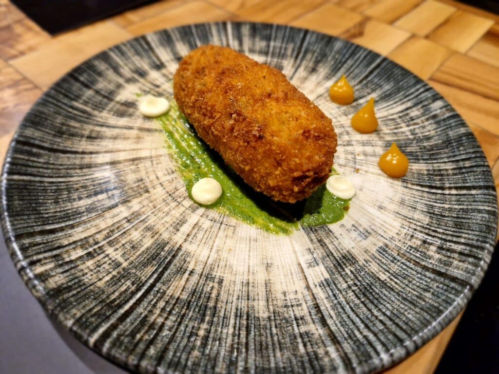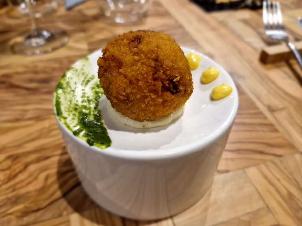 Fulgido esempio l’amuse-bouche, arancino di riso acquerello con zafferano e chorizo de bellota su salsa al formaggio iberico di pecora. O il crocchè di patate d’Avezzano al baccalà con maio al limone e gel di frutta esotica. L’inizio del percorso degustativo conferma la valenza del fondere ingredienti e tecniche differenti in cucina, per non adagiarsi sugli allori.