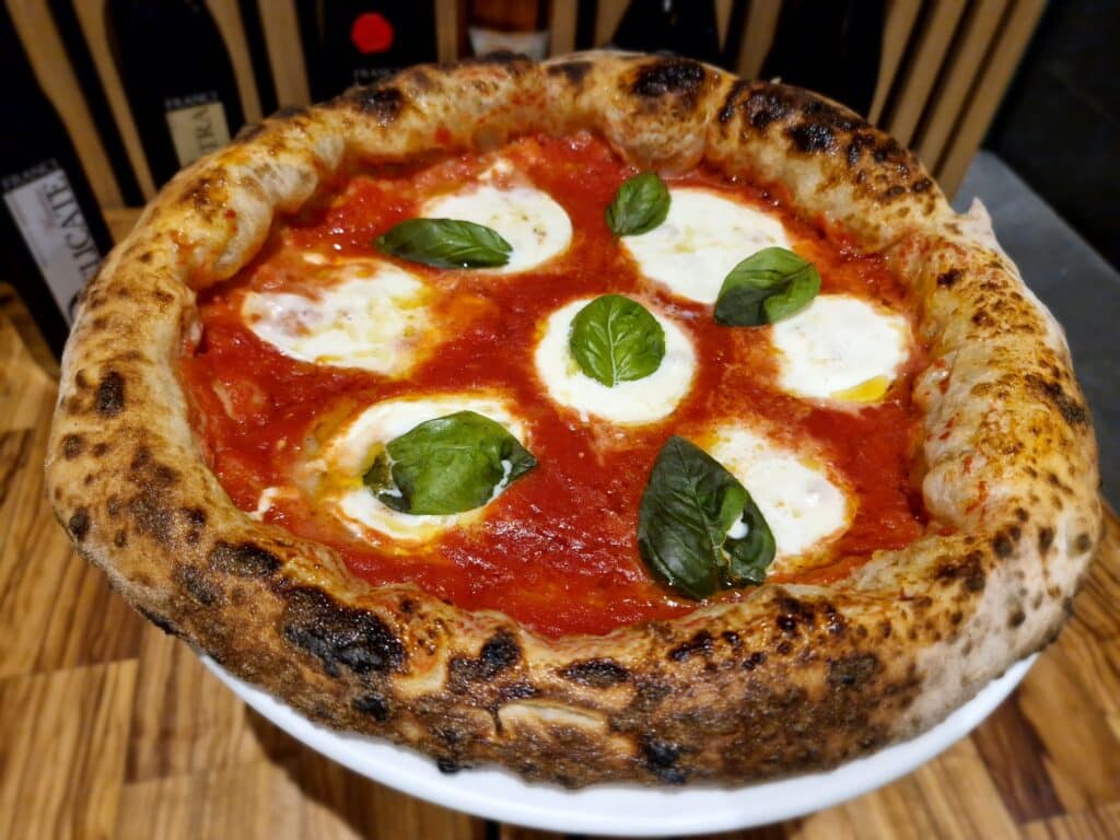 L’arrivo delle pizze è reso ancor più gradito dalla versione classica “Regina Margherita” con impasto napoletano tipo 0, condita da pomodoro San Marzano, mozzarella di bufala campana e parmigiano reggiano 24 mesi.