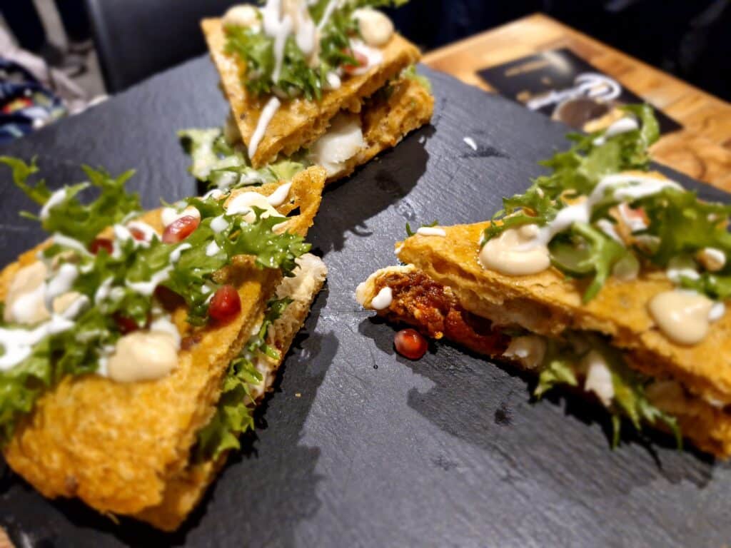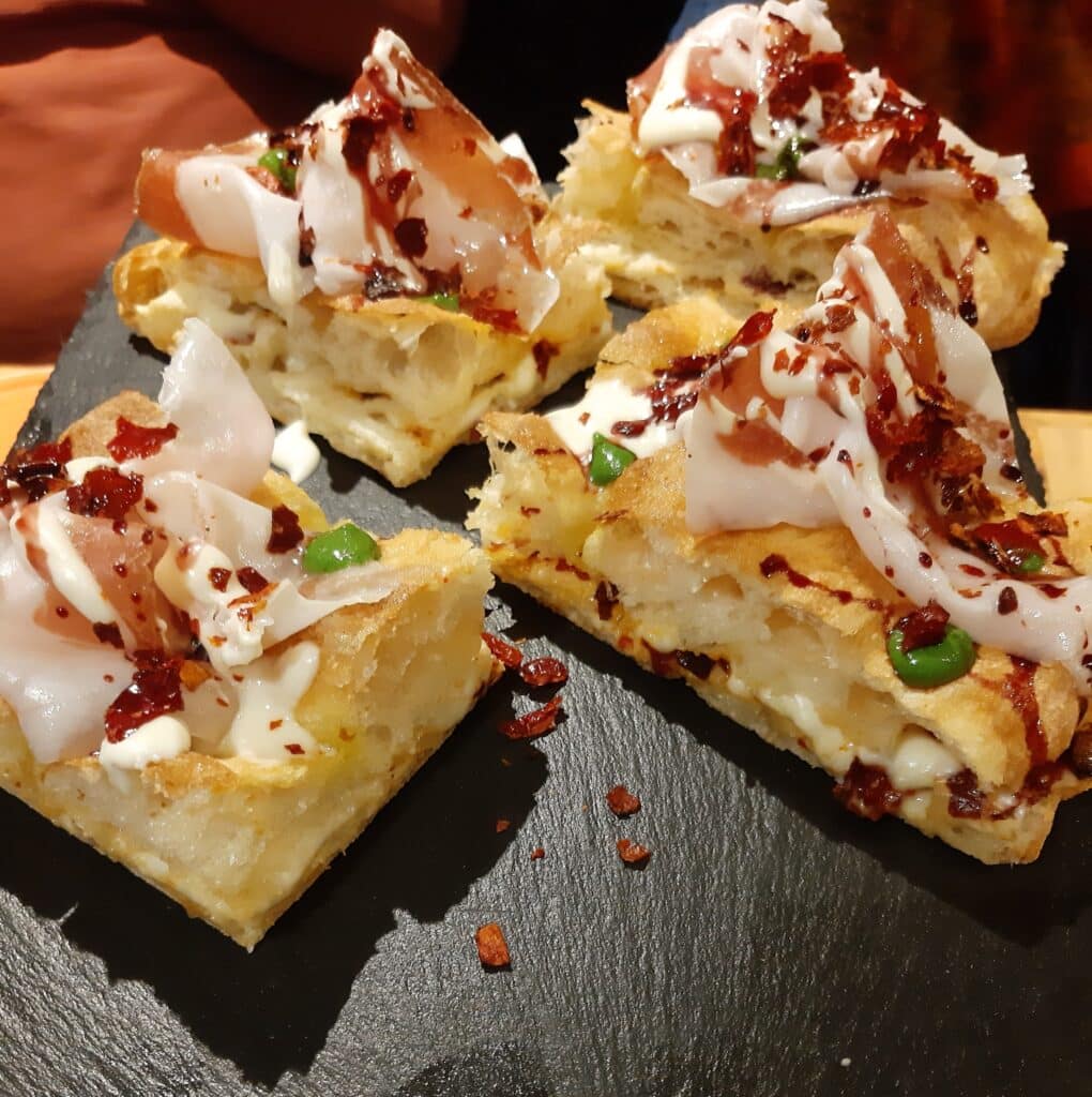 Ben presentata la pizza alla pala “Viaggio in Lucania”, esperimento ardito dei Savarese per la complessità nel dover unire il fior di latte con peperone crusco, fonduta di canestrato di Moliterno, lonzarda di maiale e riduzione d’Aglianico del Vulture. Manca poco alla perfezione, magari attraverso un maggior controllo della spinta sapida finale.