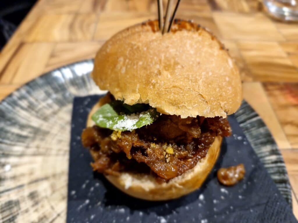 Le Genovese di carne con cui è farcito il mini bun è realizzata secondo l’antica tradizione partenopea, con i migliori tagli ideali per avvicinarci al gran finale: il capolavoro padellino di mare con impasto alla ‘nduja, insaporito da baccalà in oliocottura, scarola riccia, salsa di mozzarella, maionese alla soia e melagrana. Il miglior piatto della serata, che esprime il concetto futuro degli impasti aromatizzati.