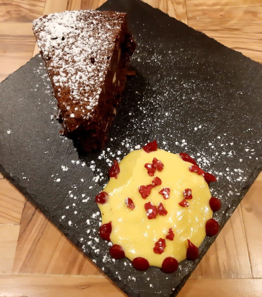 La torta caprese con cioccolato monorigine del Perù – distretto di Pachiza – mandorle di Toritto presidio Slow Food, salsa alla vaniglia e gel di lamponi chiosa un momento di estrema rilassatezza: quella voglia di sorridere e parlare di cibo, senza pensare per forza allo stress dei tempi moderni.