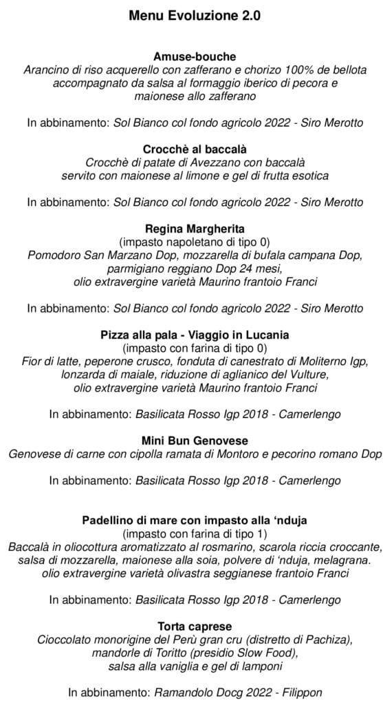 La proposta, dal valido rapporto qualità prezzo pari a 40 euro a persona (acqua inclusa, vini e bevande escluse), è stata arricchita per l’occasione da una selezione vini a carattere regionale, scelti per la presentazione ufficiale alla stampa. Previste incursioni a tema non solo nel vasto mondo dei lievitati, ma anche tra fritture, carne e persino dessert.