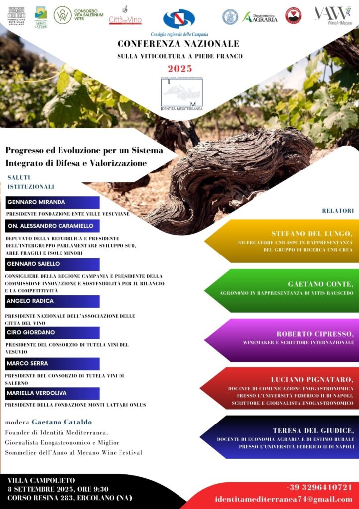 Il giorno 8 settembre 2025, dalle ore 9:30 alle 13:00, presso Villa Campolieto in Corso Resina n. 283 a Ercolano (Na), l’Associazione Culturale Identità Mediterranea ha organizzato una Conferenza Nazionale sulla Viticoltura a Piede Franco con il Patrocinio Morale del Consiglio Regionale della Campania, del Dipartimento di Agraria dell’Università Federico II di Napoli, dell’Associazione Nazionale delle Città del Vino, del Consorzio di Tutela dei Vini del Vesuvio, del Consorzio di Tutela dei Vini di Salerno, della Fondazione Monti Lattari Onlus, Fondazione Ente Ville Vesuviane e del Mavv-Wine Art Museum.