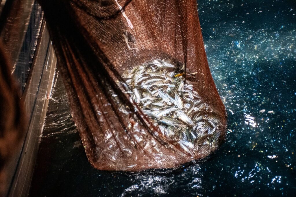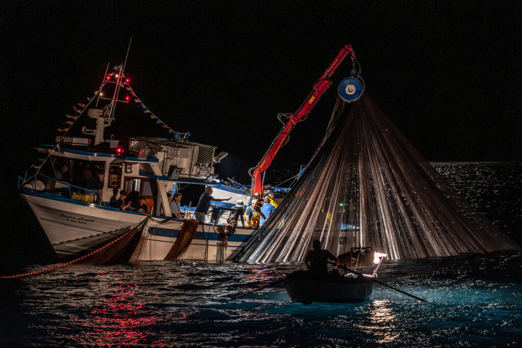 Le luci in fondo al mare. Al largo le lampare ad attirare i banchi di alici, ci fermiamo ad ammirare. Arriva l’urlo di gioia dei pescatori, dopo instancabili manovre la pesca è riuscita.