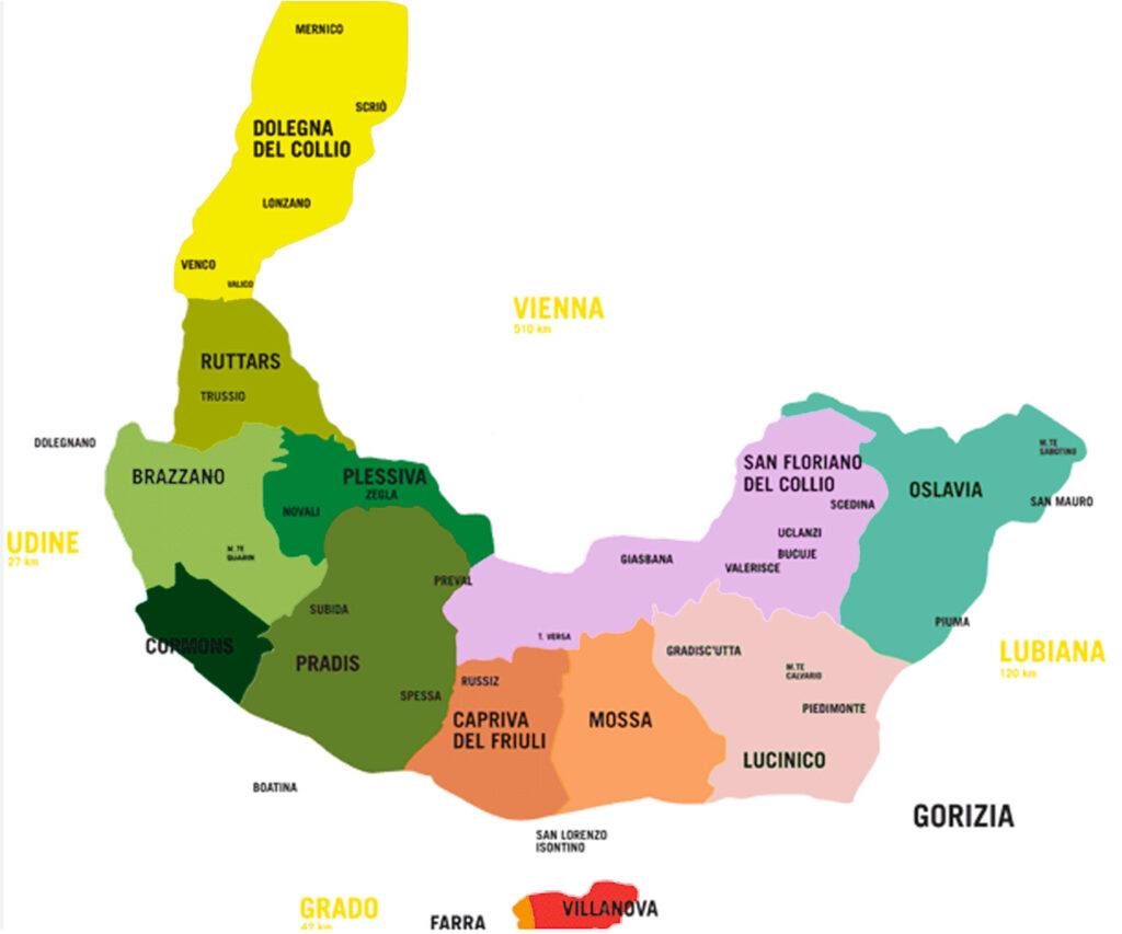 Per rientrare nella categoria di Collio Doc le uve devono provenire dal territorio della provincia di Gorizia, in 8 dei 25 comuni esistenti: Capriva, Cormòns, Dolegna del Collio, Farra d’Isonzo, Gorizia, Mossa, San Floriano del Collio, San Lorenzo Isontino. Sono esclusi i terreni del fondo valle, con l’obbligo per i vigneti di trovarsi ad almeno 75 metri di altitudine, fino a giungere a circa 270 metri, e con una pendenza minima del 3%, spesso ben superiore.