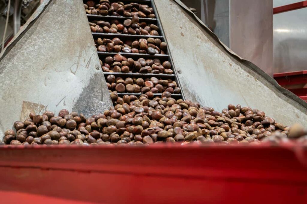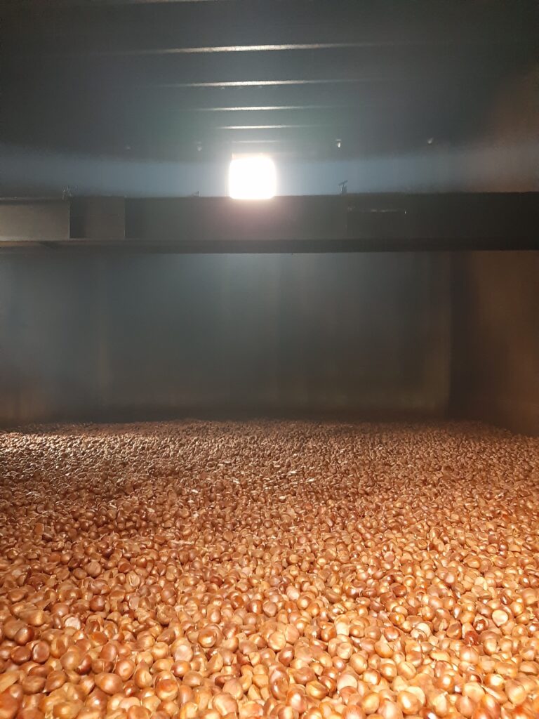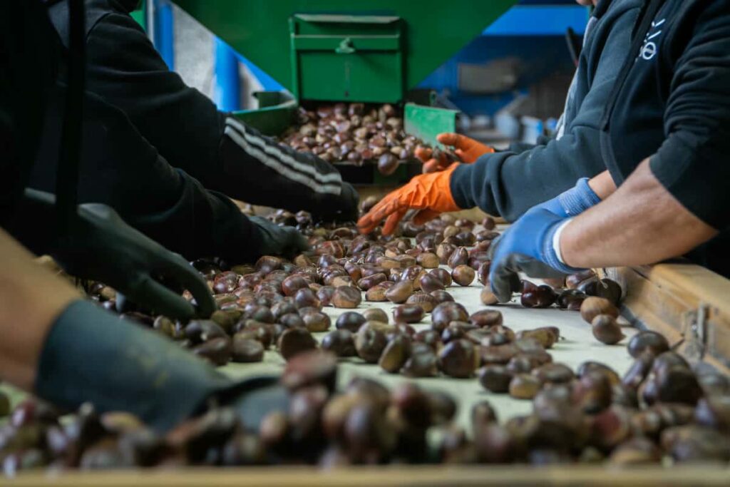 Roberto Mazzei, direttore del Distretto, ci conduce tra alcune realtà irpine, come Agricola De Maio produttore del Marrone di Santa Cristina e la Cooperativa Agricola Castagne di Montella, dove Maurizio Grimaldi ci spiega la caratteristica della pezzatura basata sul calibro e sul numero di frutti per chilogrammo. La castagna va sempre bagnata, non soltanto per ammorbidirla, ma per sviluppare la fermentazione e polimerizzazione dei tannini resi meglio digeribili dal corpo umano.