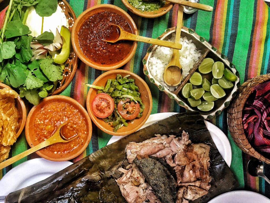 Qui gli ingredienti, oltre a quelli che compongono la base tipica della cucina messicana sono l’achiote, noto anche come annatto o rocou, è una spezia derivata dai semi della pianta tropicale bixa orellana, utilizzata come colorante naturale rosso-arancio per alimenti come formaggi e riso, e come ingrediente per conferire un sapore lievemente pepato e terroso a piatti come la cochinita pibil; poi abbiamo il peperoncino habanero, per conferire una particolarissima piccantezza alle ricette e, infine, il chaya, una foglia spinosa locale che può essere usata nelle empanadas. Tra le salse più caratterizzanti merita la menzione il sikil pak, una crema densa a base di pomodori grigliati, semi di zucca e succo d’arancia, servita su tortillas, mentre l’huevo motuleño, consiste in un piatto di uova fritte servite su tortillas con fagioli neri, formaggio, prosciutto, piselli, banana e una salsa piccante.