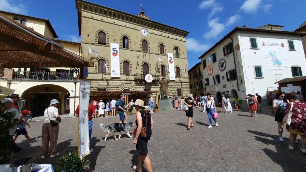 La triangolare piazza di Greve in Chianti, circondata da logge con al centro la statua di Giovanni da Verrazzano, garantisce al visitatore la possibilità di degustare e parlare tranquillamente con gli espositori. Turisti provenienti da ogni parte del mondo, attirati dall’affascinante territorio toscano, noto per i suoi castelli, i panorami di rara bellezza e le vicine città d’arte.