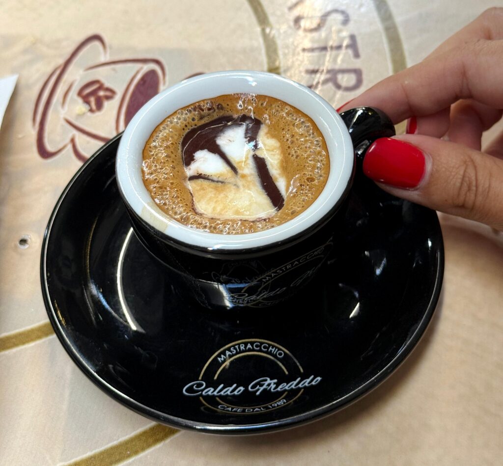 Dall’altra parte, alla cassa, c’è la moglie: elegante, cordiale, che si emoziona quando le chiedo da quanti anni lavora accanto al marito. Mi mostra orgogliosa i ritagli di due giornali stranieri, uno tedesco, l’altro spagnolo, che parlano proprio di Mastracchio e del suo famoso caffè caldo freddo. Ammetto di non averlo ancora mai provato, “il mio primo caldo freddo”.