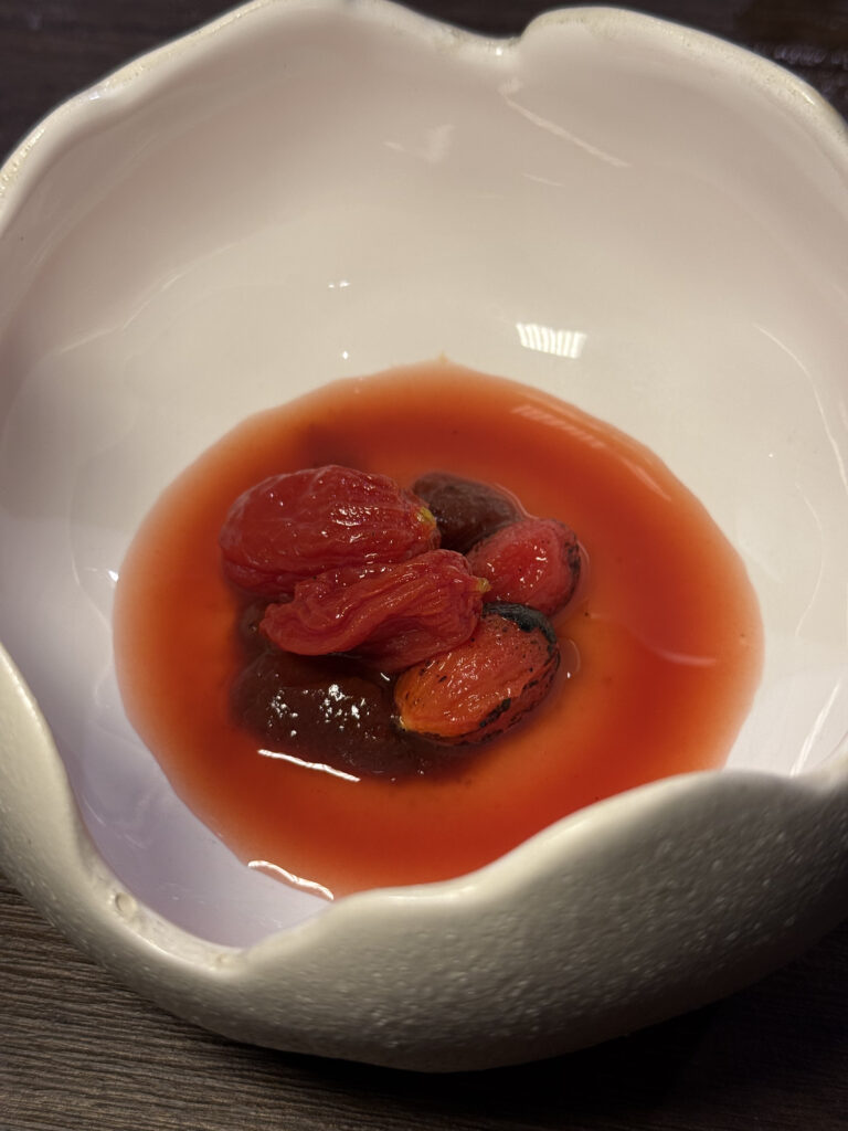 Molto interessante anche il lavoro sul pomodoro candito, bruciato e fermentato: un assaggio sorprendentemente dolce e nitido, che restituisce il pomodoro in una forma quasi essenziale.