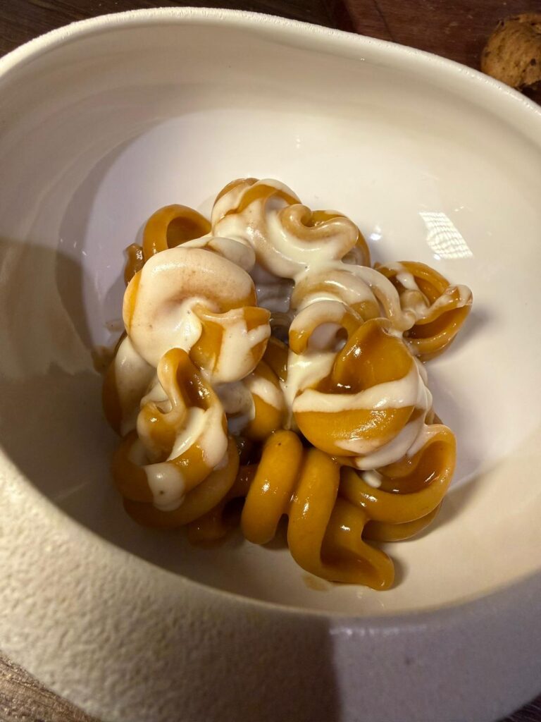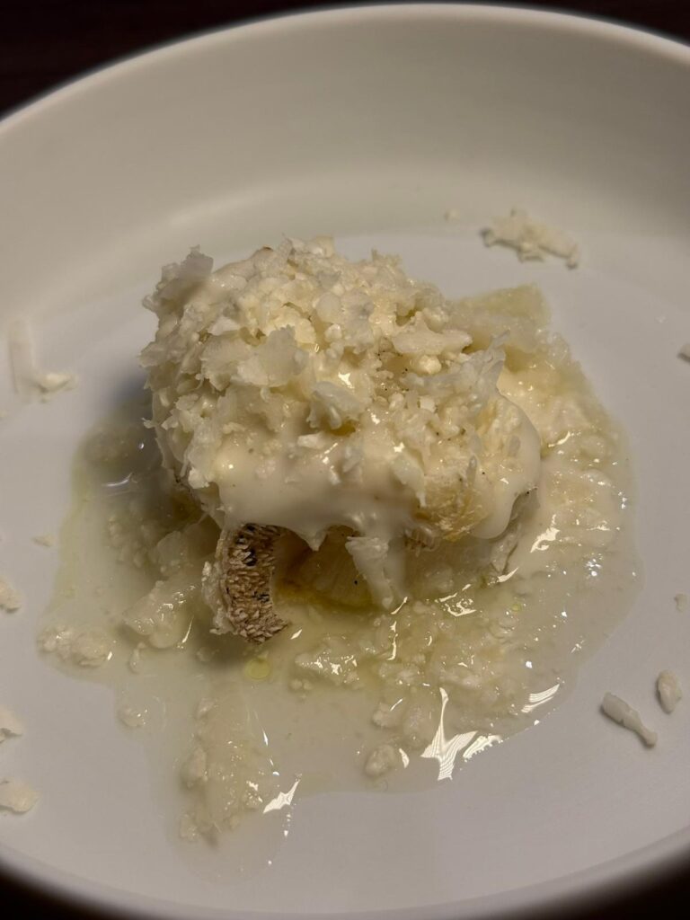 Ho apprezzato in modo particolare l’ostrica con verza e capperi, un piatto che gioca sull’equilibrio tra note vegetali e sapidità, così come le trottole con granciporro e pecorino, dove la dolcezza del crostaceo viene accompagnata dal formaggio senza sovrastarlo. Stessa cosa per le cozze e lo stoccafisso.