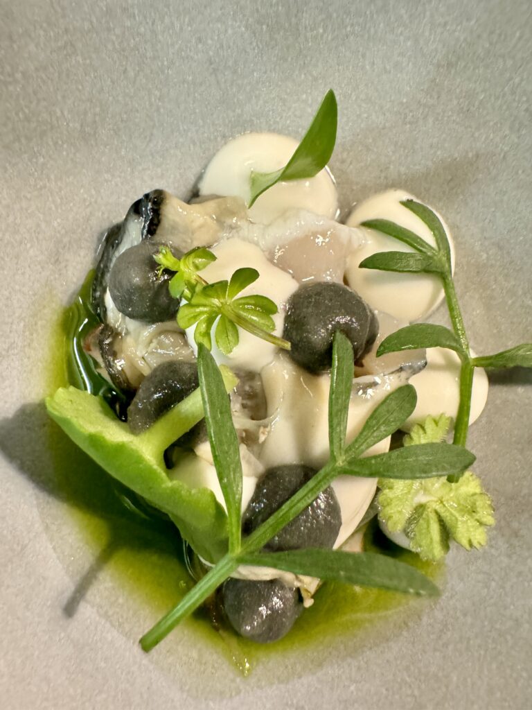 - Antipasto : Ostrica, topinambur fermentato olio di Perrillo e limone nero