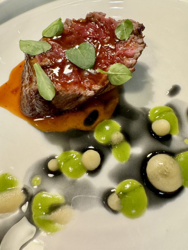 - Secondo piatto: Manzo, mela cotogna, succo di pepe Sancho e olio al carbone d’erbe