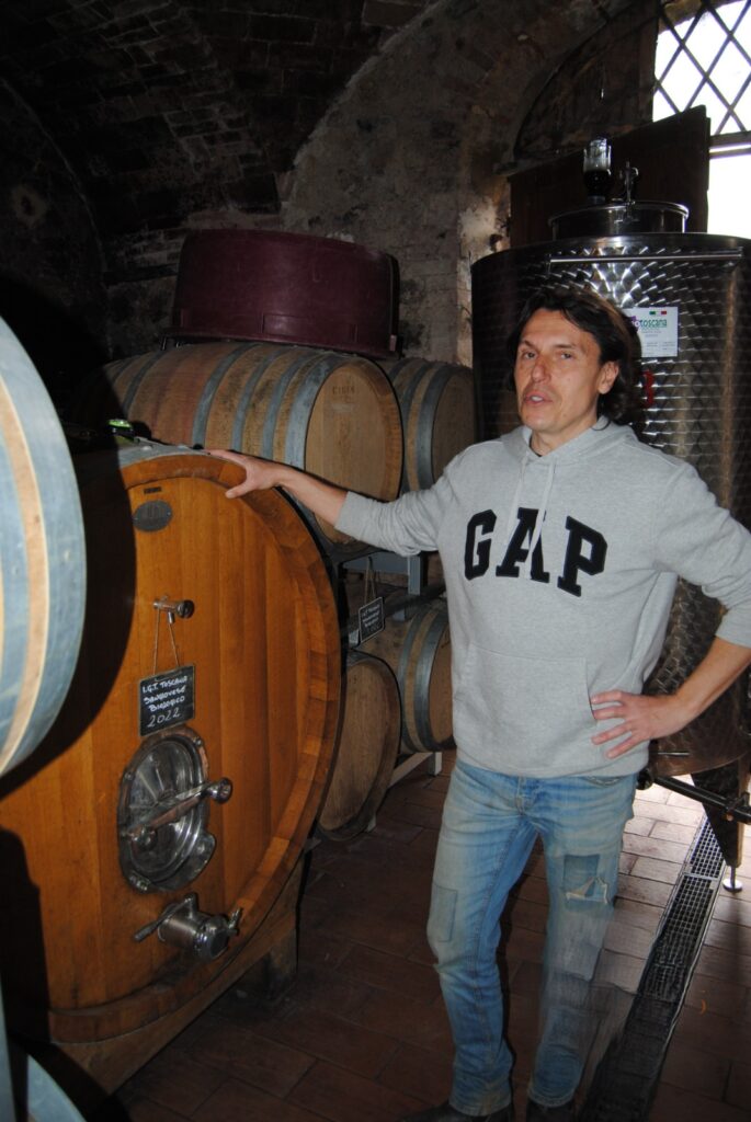 Il mastello viene poi rapidamente trasportato in cantina dove il suo ribollente contenuto servirà da innesco per l’avvio di fermentazione delle uve fresche, appena diraspate, proseguendo il proprio corso per circa 3 settimane. Infine il lungo affinamento di 24 mesi in tonneau di dieci ettolitri per l’IGT Toscana Sangiovese “Costa del Pievano”, mentre l’IGT Toscana Sangiovese “Ametato” va in barrique di Borgogna sempre per due anni prima di un altrettanto lungo riposo in bottiglia. Riempiamo finalmente il calice, nel tinello del piccolo agriturismo aziendale inaugurato a luglio 2024 ed affidato alle accoglienti cure di Simona Ruggieri, moglie farmacista di Giacomo Sensi.