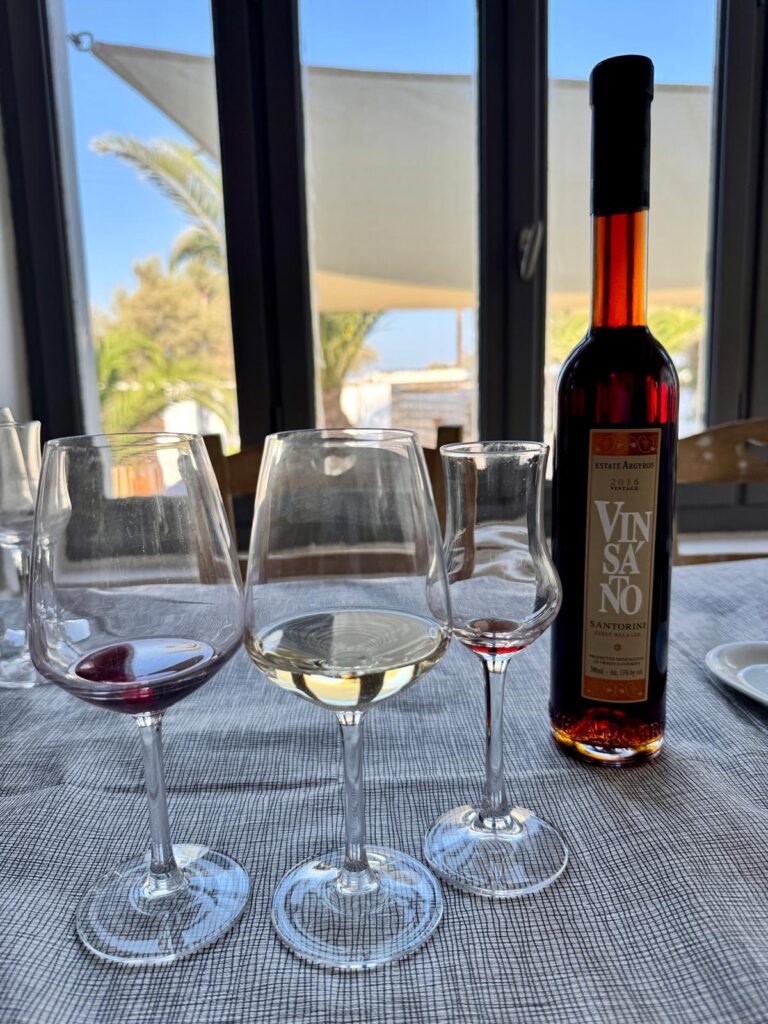 Visitare Estate Argyros significa vivere un’esperienza completa: dalla passeggiata tra i filari bassi a cestino, al racconto delle tecniche viticole uniche dell’isola, fino alla degustazione guidata nella moderna sala panoramica. Un viaggio nel tempo e nel gusto, capace di coniugare rispetto per la tradizione e visione contemporanea. In un luogo dove il vulcano ha plasmato la terra e la storia, i vini di Estate Argyros raccontano la forza e l’identità di Santorini, sorso dopo sorso. A Santorini, il vino non è solo un prodotto agricolo: è cultura, paesaggio e storia. Ogni sorso porta con sé millenni di resilienza, dall’epoca minoica alla rinascita post-eruzione. E quando, alzando il calice, brindano dicendo “Già mas”, non è solo un augurio: è un invito a far parte di un’isola che ha fatto del vino la sua anima.