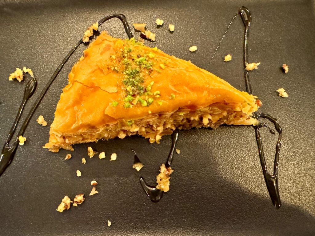 E poi i dolci: il Baklava preparato con strati sottilissimi di pasta filo alternati a noci, mandorle e pistacchi tritati arricchiti da spezie come cannella o chiodi di garofano. Dopo la cottura viene irrorato con sciroppo di miele e limone, viene tagliato a triangoli ma si può trovare anche tagliato a quadrato o a rombo.